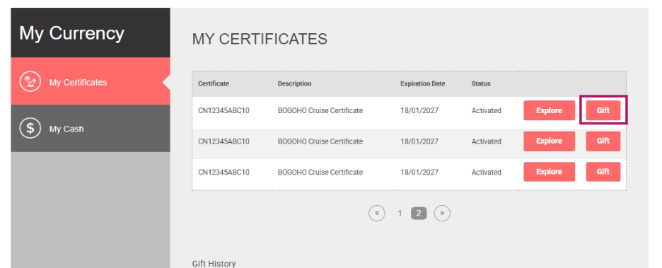 - Gift Option: Choose Gift if you wish to transfer the certificate